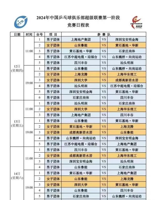 北京时间12月12日,2024赛季中国乒乓球俱乐部超级联赛第一阶段比赛12月12日-16日要在长沙中南大学体育馆开打啦,第二阶段则是12月30-2025年1月1日,共有15支参赛队伍,包括9支男团和6支女团,国乒主力队员也都悉数参加,分别有马龙、樊振东、王楚钦、林诗栋、林高远、梁靖 、孙颖莎、王曼昱、王艺迪、陈幸同等,可惜了陈梦没有报名,但是会参加老瓦杯,而马龙也将参加老瓦杯,到时会缺席第一阶段。这次比赛也相当有看点,还有外协会实力选手,分别有林昀儒(中国台北)、黄镇廷(中国香港)、安宰贤(韩国)、松岛辉空(日本)、吴咏琳(中国香港)、木原美悠(日本)等选手报名。具体信息如下: