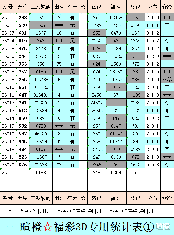 26021期:暄橙福彩3D综合条件(本期将在1月21日21:15开)一、上期回顾 ☆1、上期开奖号:6 7 6。2、和值