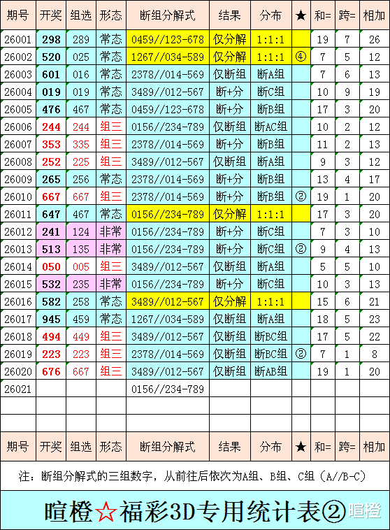 26021期:暄橙福彩3D综合条件(本期将在1月21日21:15开)一、上期回顾 ☆1、上期开奖号:6 7 6。2、和值= 19,跨度= 1。3、组三形态,001路组合。4、热度分布(热:温:冷)0:0:3。二、本期条件 ☆1、三期缺码:0158。2、热:245,温:0369,冷:178。3、断组分解式:0156//234-789。4、四胆:1357;三胆:157。三、术语解释 ☆1、三期缺码:0至9这十个自然数当中,未在近三期开奖号出现的数字。2、热度(热温冷):自然数0至9,在近七期开奖号中,出现3次及3次以上的数字,称为热码;出现2次的数字,称为温码;出现1次和未出现的数字,称为冷码。某个数字在开奖号中出现几个,就按几次计算。3、断组分解式:将0至9这十个自然数,分成三组数字,从前往后依次为A组(4码)、B组(3码)、C组(3码),一般情况下,有一组数字不出码,偶尔会有两组数字不出码。A组不出码的情况相对较少。断组为主,分解为辅。4、常态组六号码:同时包含大数、小数、奇数、偶数、质数、合数的组六号码,共有72注。统计表中,简称“常态”。5、非常态组六号码:全大数、全小数、全奇数、全偶数、全质数、全合数等六种形态的组六号码,共有48注。统计表中,简称“非常”。★提醒:彩市有风险,参与须谨慎!水平有限,仅供参考!