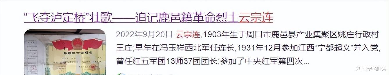 2、英雄壮举“抢占泸定桥”——回忆鹿邑英雄云宗连——鹿邑新闻 2022年9月20日在革命历史中,有一段关于鹿邑籍烈士云宗连的英勇事迹,那就是“抢占泸定桥”。今天,我们再次追忆这位英雄的壮举。云宗连,作为鹿邑的骄傲,他在那场激烈的战斗中,展现出了非凡的勇气和决心。面对敌人的重重防守,他没有退缩,而是带领战友们奋勇向前,誓要拿下泸定桥。那场战斗惊心动魄,云宗连和他的战友们冒着枪林弹雨,冲过了敌人的封锁线。他们凭借着坚定的信念和顽强的毅力,最终成功抢占了泸定桥,为后续的战斗赢得了宝贵的胜利。云宗连的英勇事迹将永远铭刻在历史的长河中,他的精神也将激励着后人不断前行。作为鹿邑的一份子,我们深感自豪和骄傲,同时也将永远怀念这位伟大的革命烈士。