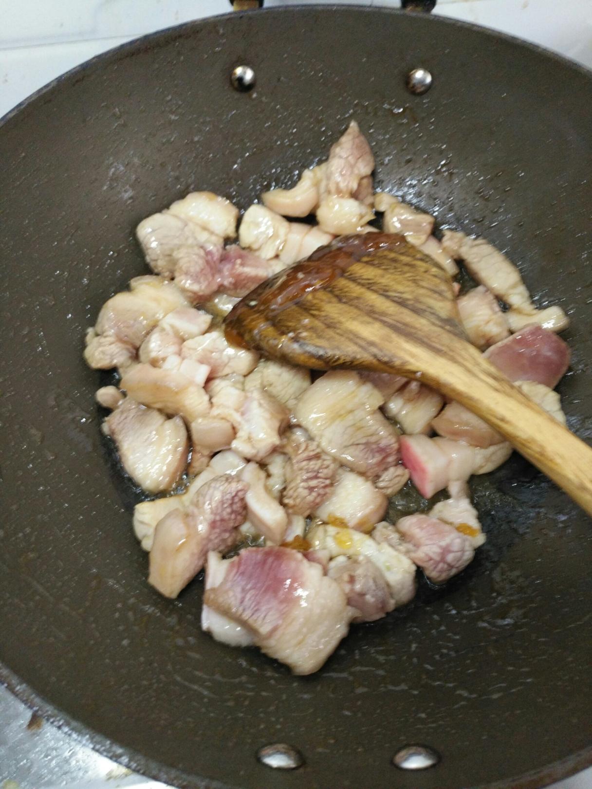 煸炒五花肉:锅中倒入适量食用油,油热后放入沥干水分的五花肉块,小火煸炒。煸炒至五花肉表面微黄,出油,这样烧出来的肉不会过于油腻。