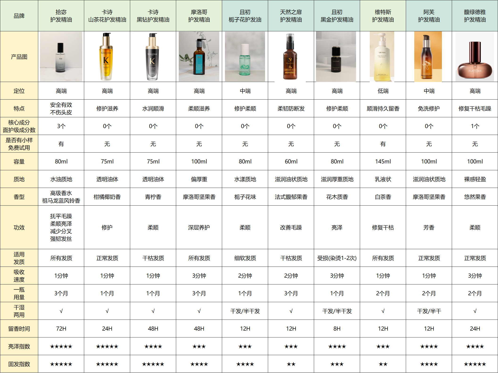 市面上部护发精油具体对比表: