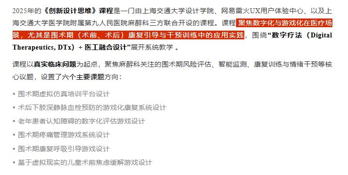 在上交×网易×九院麻醉科联合推出《创新设计思维》课程中,就在积极探索游戏在医疗场景中能起到什么作用;和米哈游联合建立的实验室,研究方向同样包括功能性游戏开发、脑机接口软硬件开发、数字医疗等。