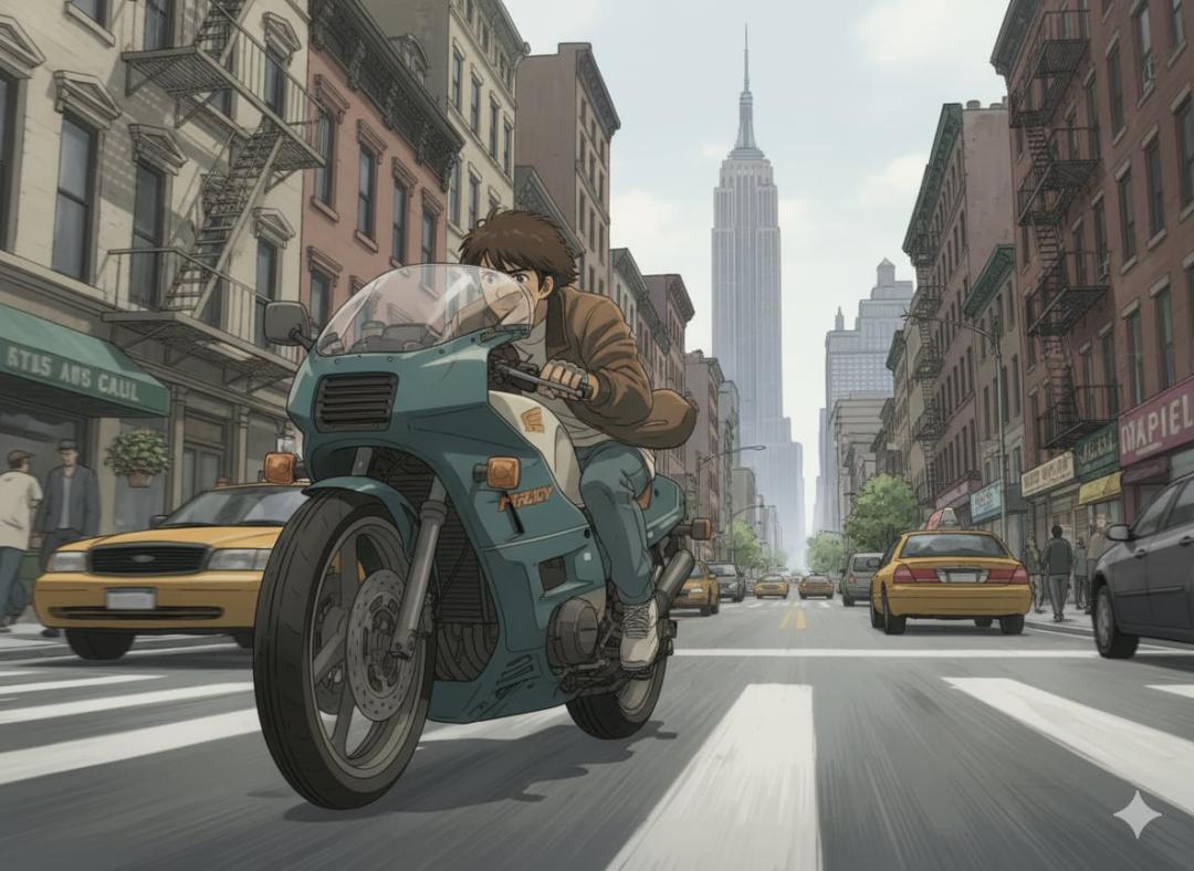 继续上传原始图像并输入提示词:Create an image of this same character riding his motorcycle at high speed through the streets of New York City during the daytime. Keep the same detailed anime-inspired art style, color palette, and atmosphere. Generate side shot of the man riding through the street.