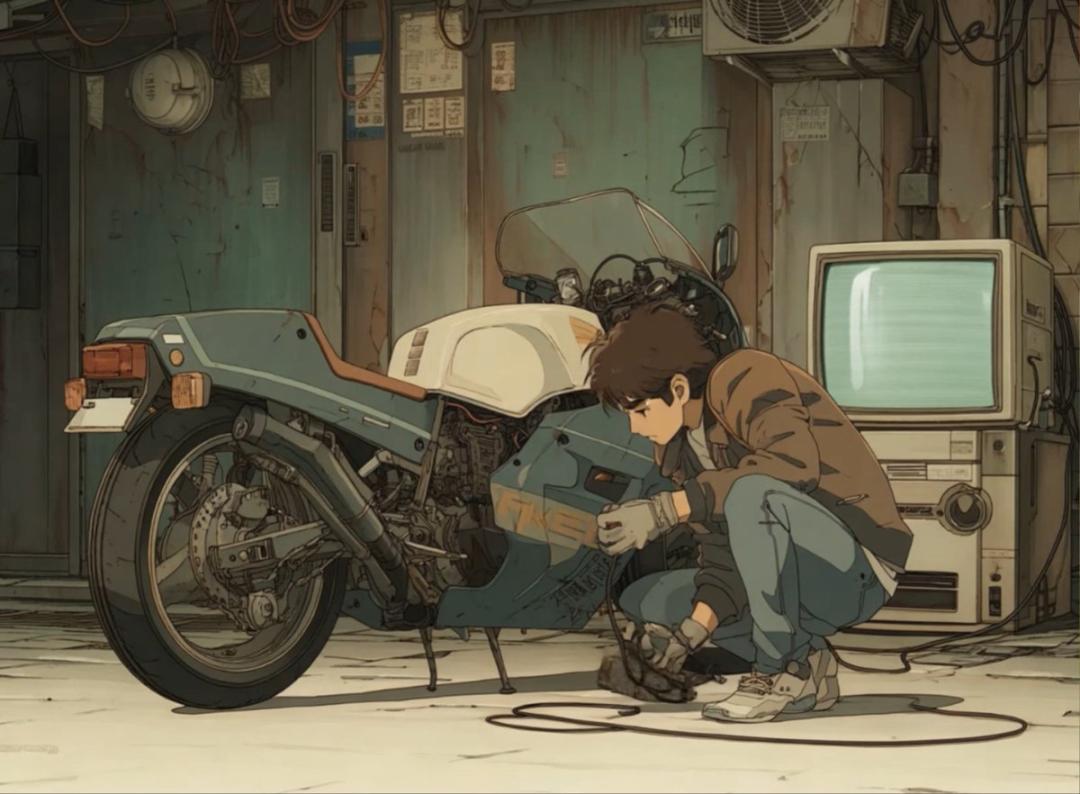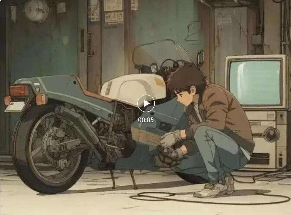 第一步:下面这张原始图像定义了动画中的角色、风格和环境,我们将它上传至豆包或即梦,输入提示词:Man fixes his motorcycle.[Cut] Man fits a missing part onto the side of the motorcycle.[Cut] Close-up shot: the man's face satisfied as he is looking at the motorcycle.(男人修理他的摩托车。[跳切] 男人将一个缺失的部件装上摩托车。 [跳切] 特写镜头:男人看着摩托车,脸上露出满意的表情。)