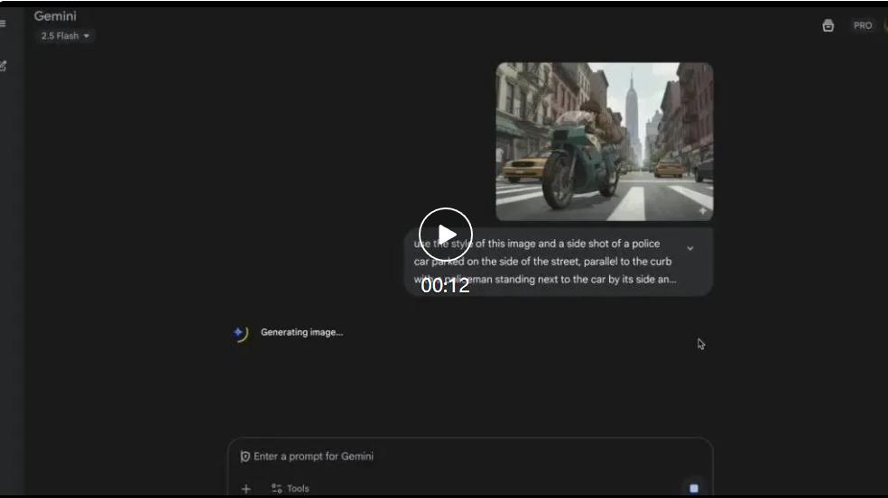 继续重复以上工作流生成下一个跳切场景。使用 Nano Banana 上传刚刚生成的图像,输入提示词:Use the style of this image and create a side shot of a police car parked on the side of the street, parallel to the curb with a policeman standing next to the car by its side and looking at the street.(使用这张图片的风格,创建一个警车停在街道旁边,平行于路缘,警察站在车旁边看着街道的侧面镜头。)
