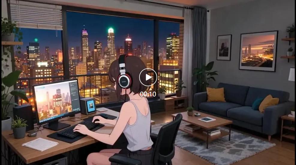 其中图片提示词:A woman is working at her chill desk in a large home living room in a rooftop penthouse, wearing large headphones, a photo of a city outside.