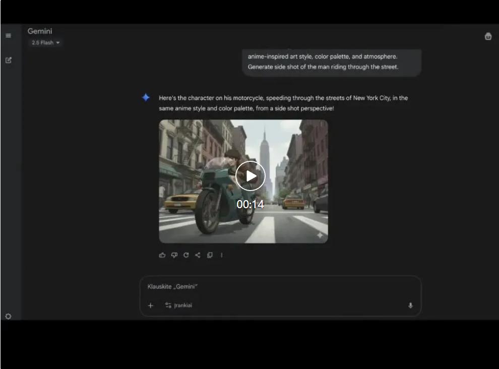 第二步轮到 Nano Banana,生成同一个动漫人物骑摩托穿过街道的场景。