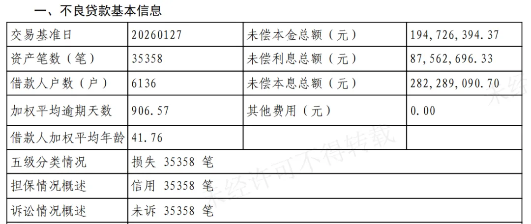 公告显示,交通银行山东省分行上述不良资产包的未偿本金总额为1.95亿元,未偿利息总额为8756.27万元;借款类型为个人消费贷款,加权平均逾期天数为906天,资产笔数共计35358笔,全部为信用贷款;其中,已损失35358笔,未起诉35358笔。