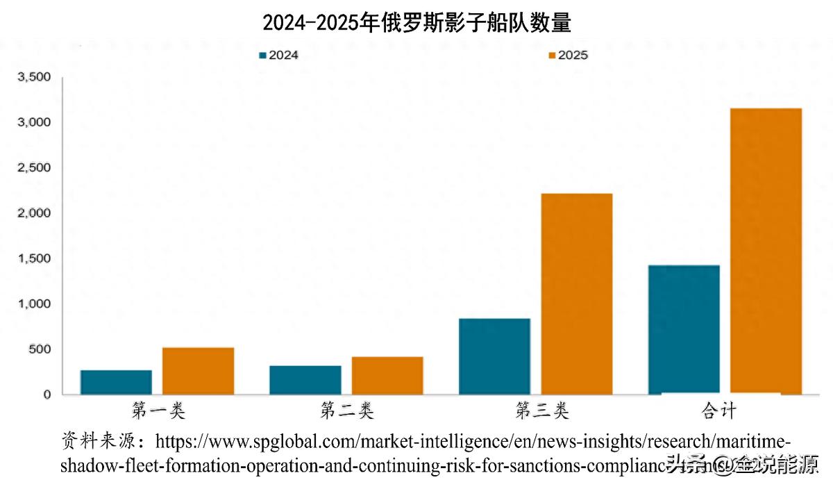 标准普尔全球市场情报(S&P Global Market Intelligence)2025年5月26日发布的报告,将俄罗斯的影子船队分为三类,其中第一类包括被美国、英国、欧盟、瑞士和联合国指定为逃避制裁的船只,第二类包括所有权不透明的船只,第三类涵盖了拥有更多合法船东并由2022年前成立的航运公司建造的船舶。标普全球统计,自2022年12月5日以来,有3154艘船只参与了俄罗斯石油的运输,这一数字占全球在役石油和成品油船船队(等于或超过27,000载重吨)的48%,其中由第一类和第二类油轮组成的影子船队,占全球在役石油油轮船队的17%,这支船队共有940艘船只,比2024年5月估计的数量增加了45%。