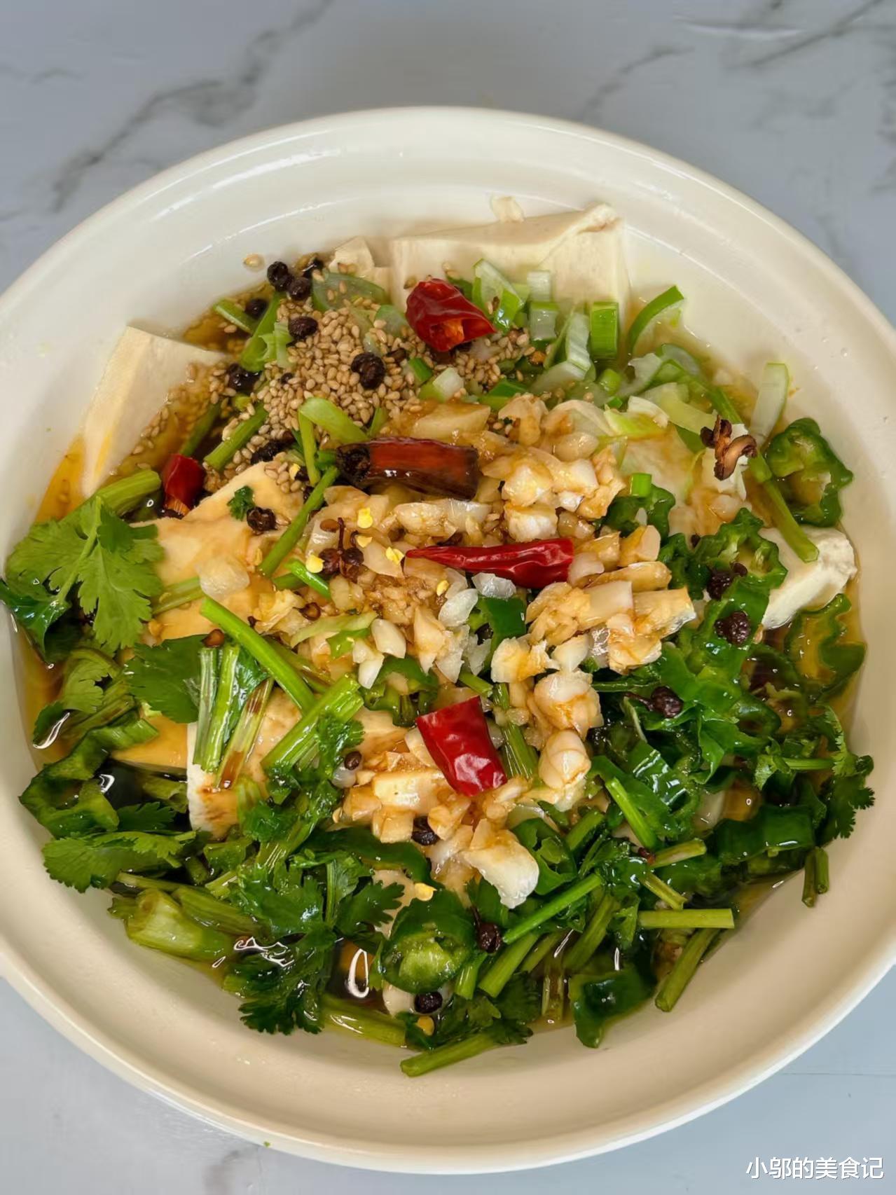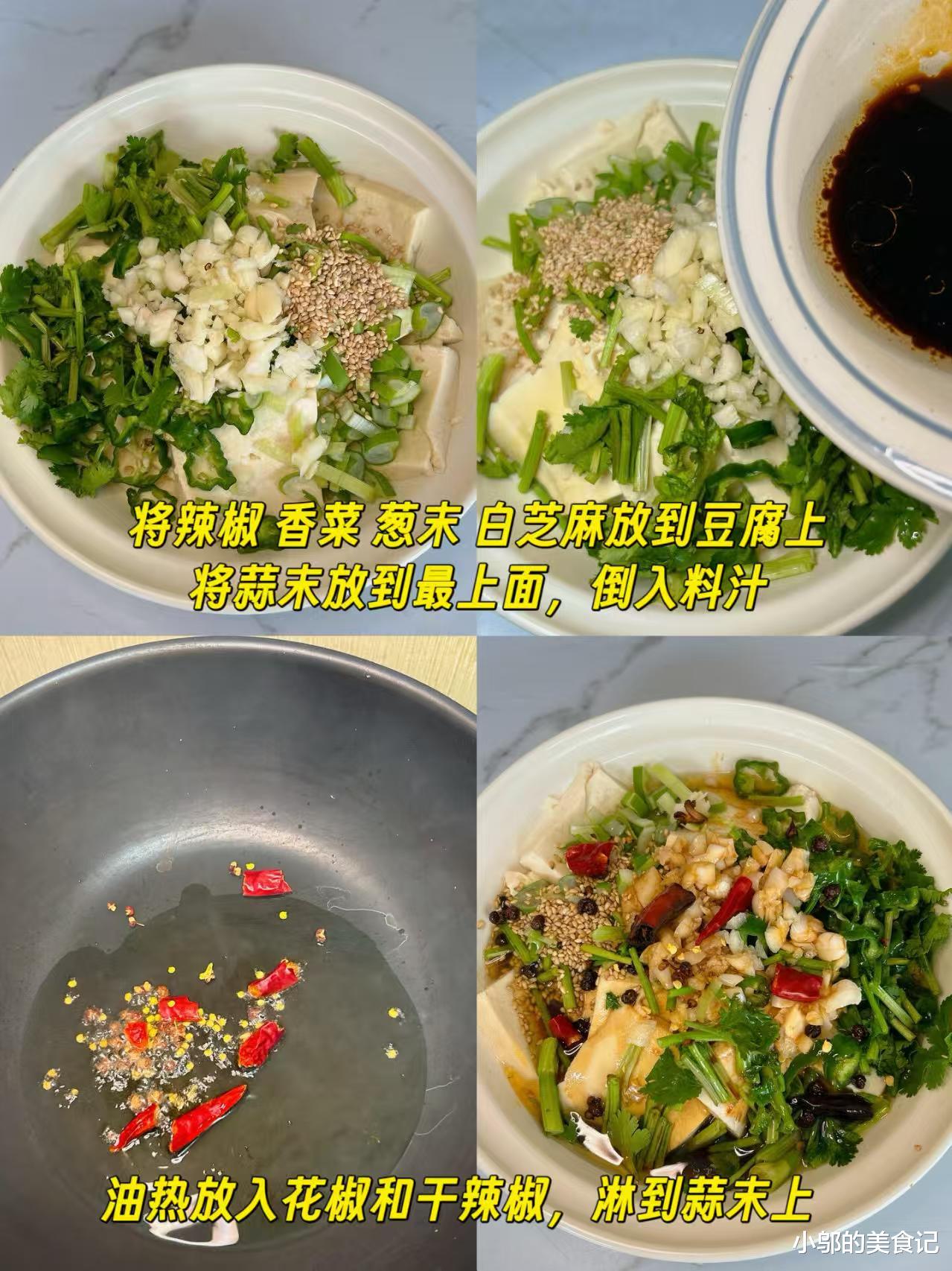 现在开始热油,小锅里倒上适量食用油,大概能没过配料的量就行,开中小火把油烧热,等油面开始微微冒烟,抓几粒花椒丢进锅里,能听到轻微的“噼啪”声,说明油温刚好。这时候赶紧把热油连花椒一起淋在豆腐最上层的蒜末上,“滋啦”一声过后,蒜香、椒香和香菜的香气瞬间爆发,整个厨房都弥漫着勾人的香味,蒜末被热油烫得微微发黄,看着就诱人。