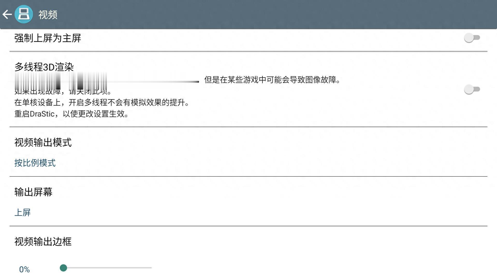 更改选型-视频-下拉-视频输出模式-按比例模式更改选型-视频-下拉-输出屏幕-上屏/下屏(根据上面方案选择,上屏可以用快捷键或者模拟器选项切换显示内容)更改选型-视频-下拉-视频输出边框-推荐拉到0