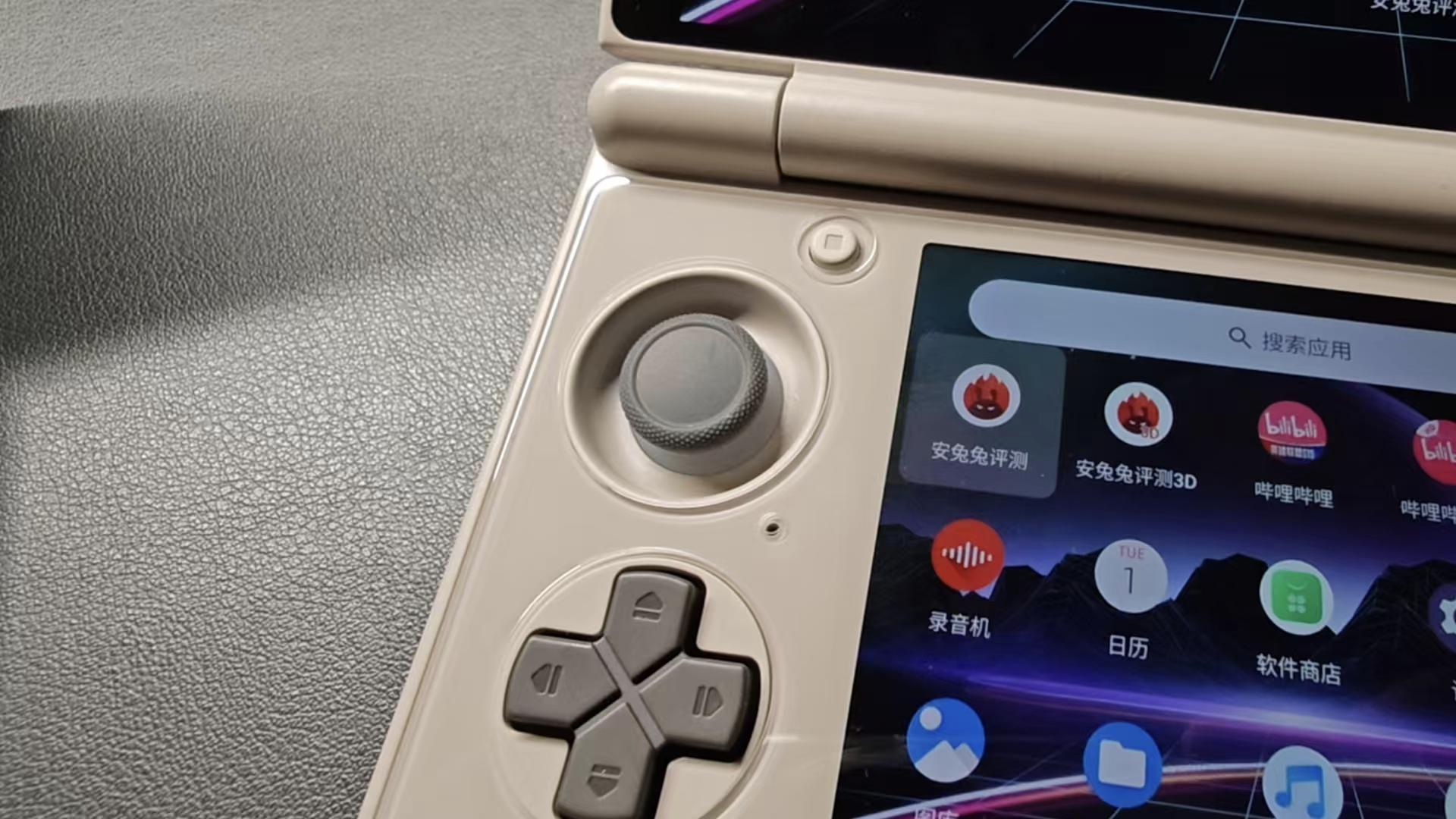摇杆部分采用向下挖槽设计,整体轻微高于 C 面,行程方面相对偏短,不过在翻盖机器中已经算是很不错的摇杆了。另外摇杆下方还布置有 RGB 灯,可以在掌机设置/TCC 重调整颜色、亮度与饱和度。