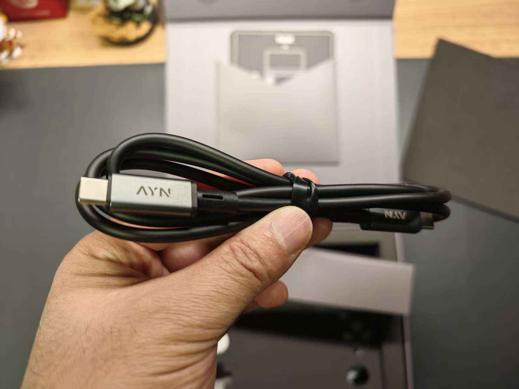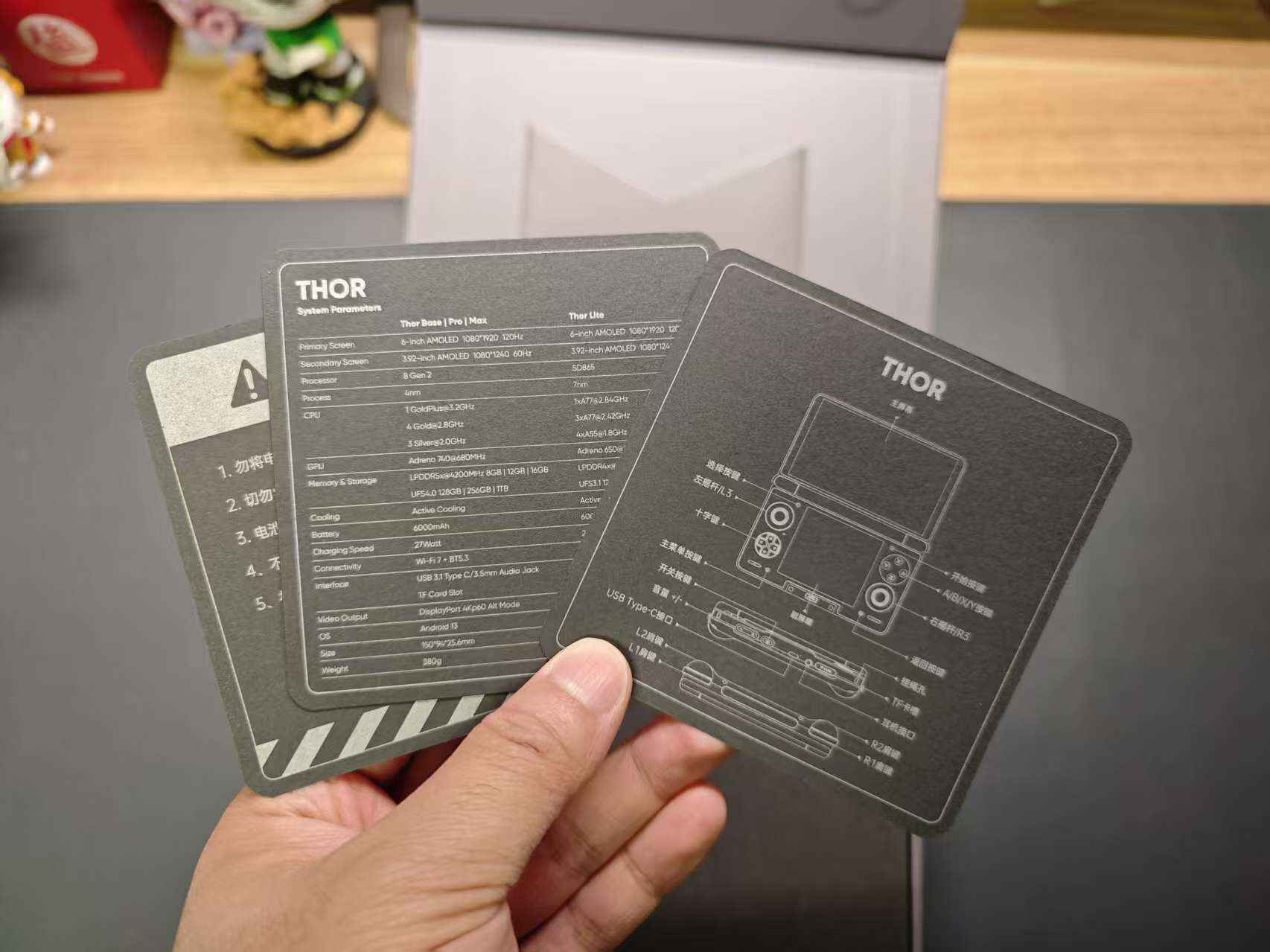 Thor(伪)开箱拿到机器那天比较着急就先开箱玩了,所以这一组开箱照片是后补的,属于纯纯的伪开箱。外包装方面 Thor 比 AYN 之前的几款机器(奥丁2/2p)显得更高级一点,打开后参数表印刷在小手卡上,配件有一根全功能 C2C 线做工很不错,但依旧很环保的没有充电头。