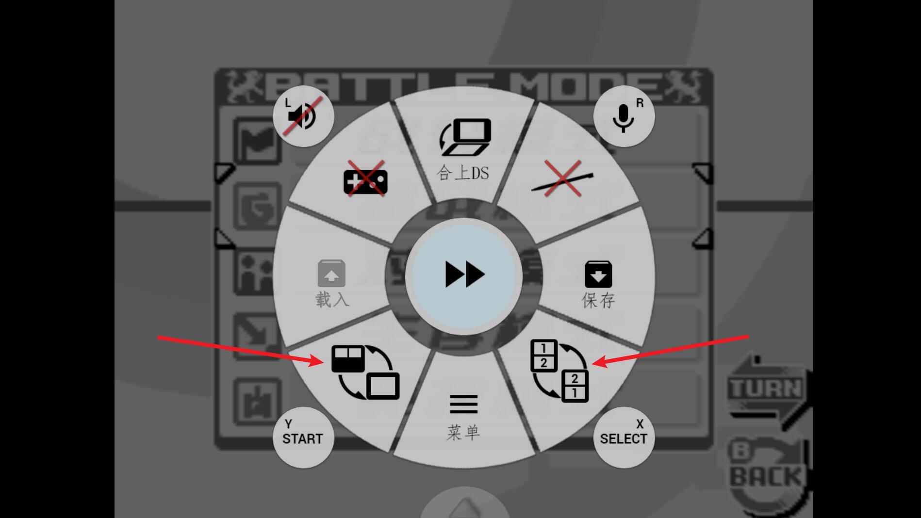 ▼如果你的主屏显示是左右两个屏幕,那边点左下红色箭头的切换屏幕布局进行切换,如果是要交换机器主屏显示 NDS 上屏/下屏,点击右下红色箭头的12-21按钮。