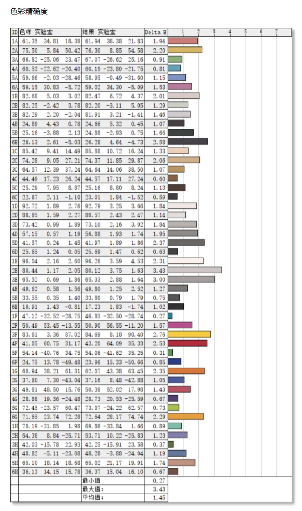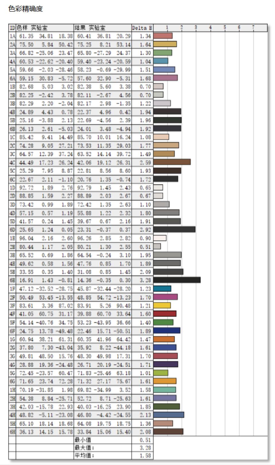 色准部分部平均色差上屏1.58、下屏1.45,最大色差上屏3.28、下屏3.43,平均值满足<3的显示器色差标准,在小厂机器中算是很不错的屏幕。在48个色块中,虽然部分色块色差的方向不尽相同,不过就算以 DeltaE 绝对值相加也没有几个超过6的点,两块屏幕显示效果的一致性还是值得肯定的。