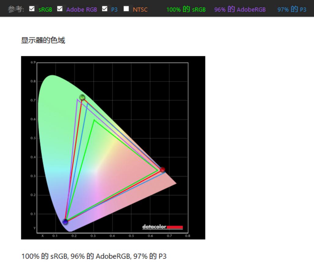 这里依然使用 Datacolor 的红蜘蛛 Elite 版本进行屏幕测试,色域覆盖部分两块屏幕都没有做色域缩放,系统默认设定下都覆盖了100%的 DCI-P3 色域,运行复古的游戏平台可能会相对偏艳丽(饱和度高)一些。