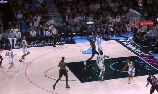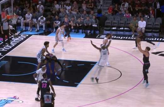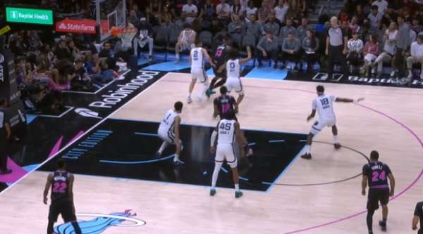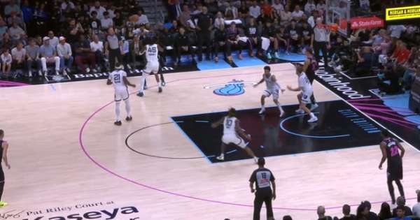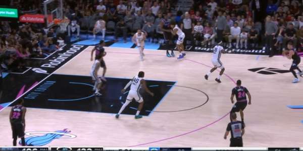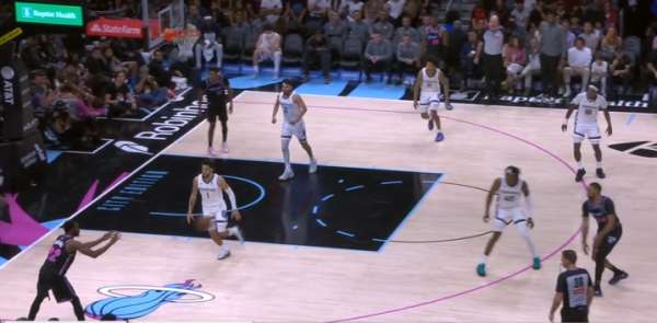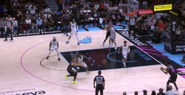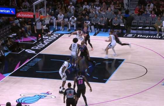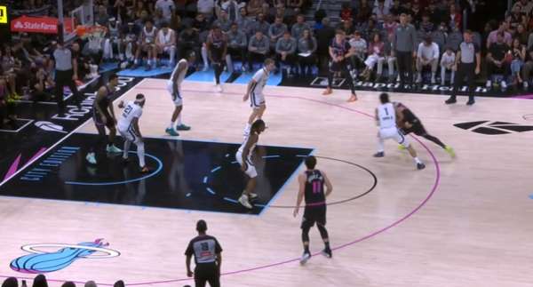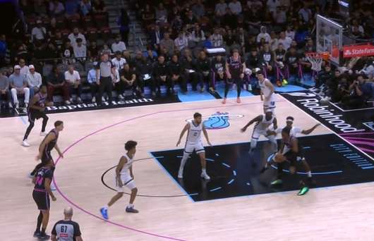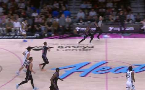 自行运球突破包围圈后阅读到弱侧希罗、威金斯二打一于是出球给希罗,