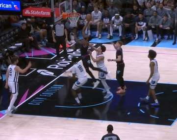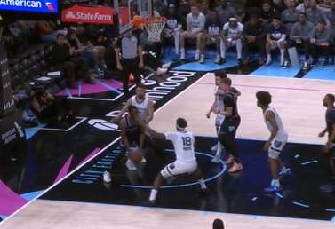 面对前来补防的灰熊球员佯装走右路杀入篮下,