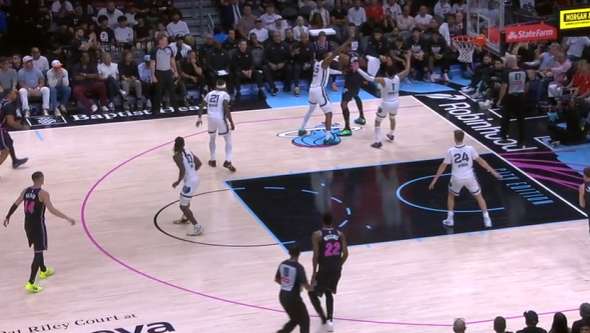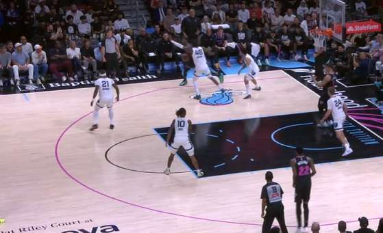 希罗突破撕扯灰熊防线遭遇斯潘塞刷卡协防的瞬间,立即跳起出球给底角的威金斯,