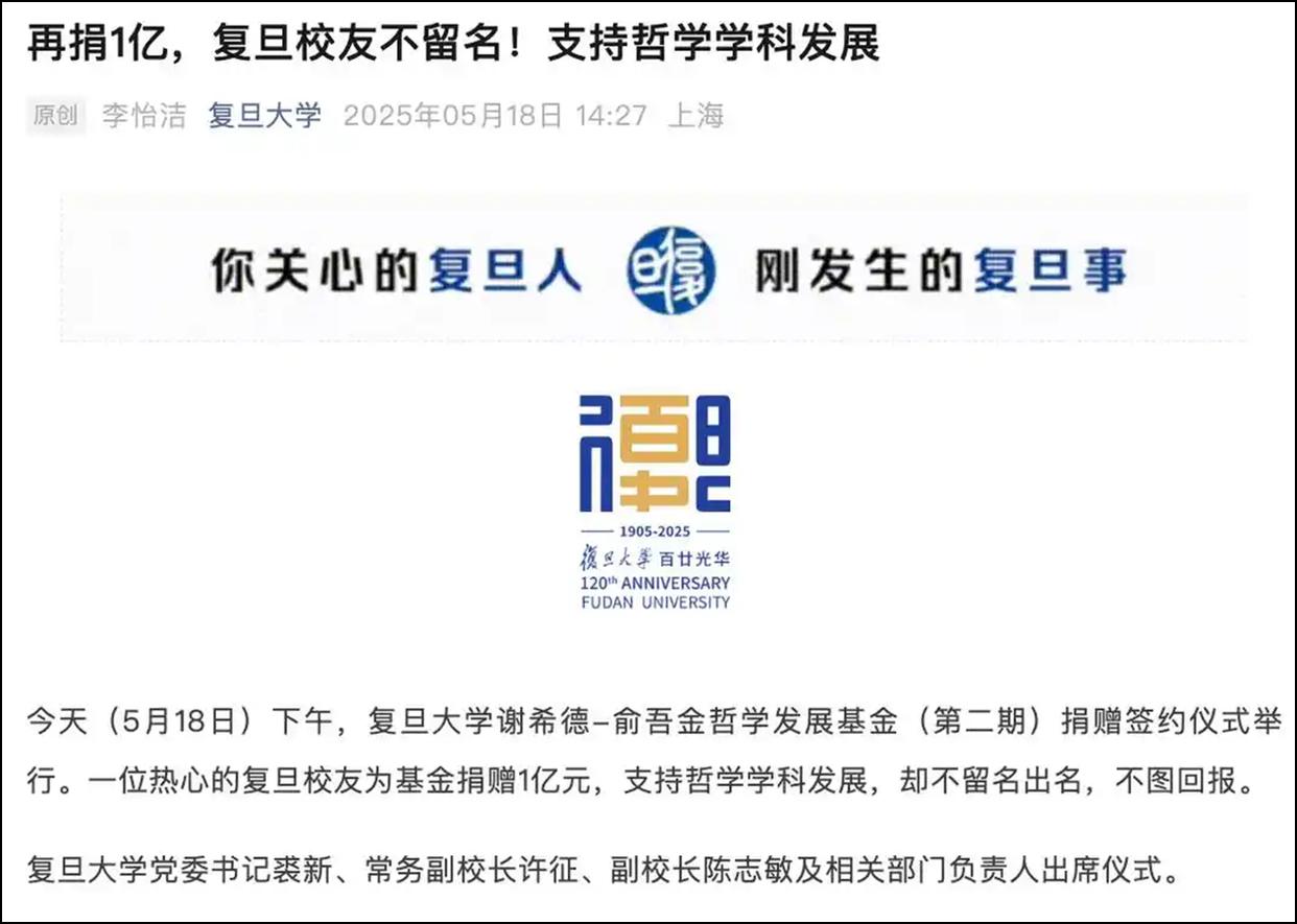 5月18日下午,复旦大学谢希德—俞吾金哲学发展基金(第二期)捐赠签约仪式举行,一位热心的复旦校友匿名为基金捐赠1亿元,支持哲学学科发展,不留名不图回报。