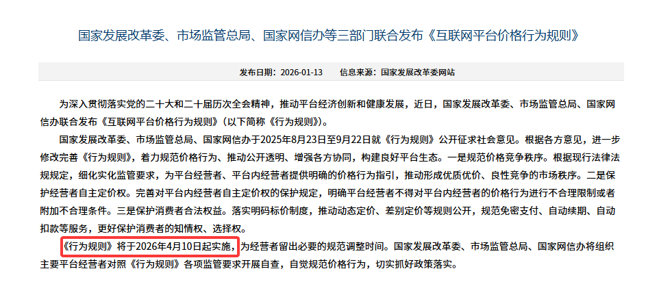 2026年4月10日,《互联网平台价格行为规则》将正式施行。这份由国家发改委、市场监管总局、国家网信办联合发布的新规,给平台定价画了几条明确的“红线”。