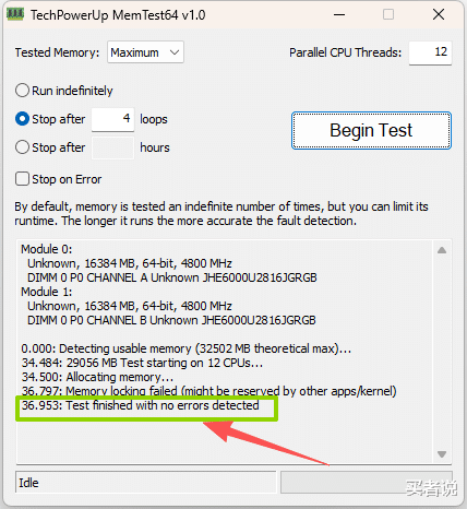 首先,用MemTest64对32G满载容量进行了4轮压力测试,错误数始终为 0,无崩溃或数据校验失败;