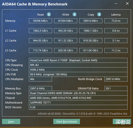 用AIDA64进行性能跑分,玖合异刃在6000频率下,延迟73.8ns。