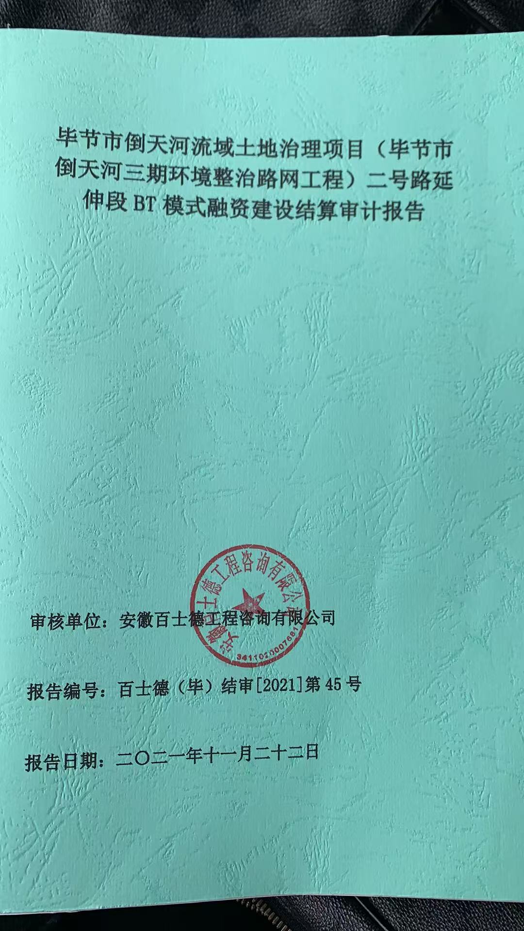 2021 年 11 月 22 日,德溪建设公司委托的审计单位安徽百士德工程咨询有限公司出具《竣工结算审计报告》,确认德溪二号路延伸段项目结算总价为,并最终经建设单位、施工单位、监理单位及审计单位审定为3600余元。