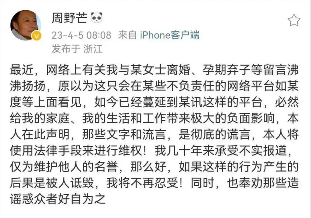 2022年,有自媒体为了博取眼球,编造了周野芒出轨嫩模、卷走家产的谣言。
