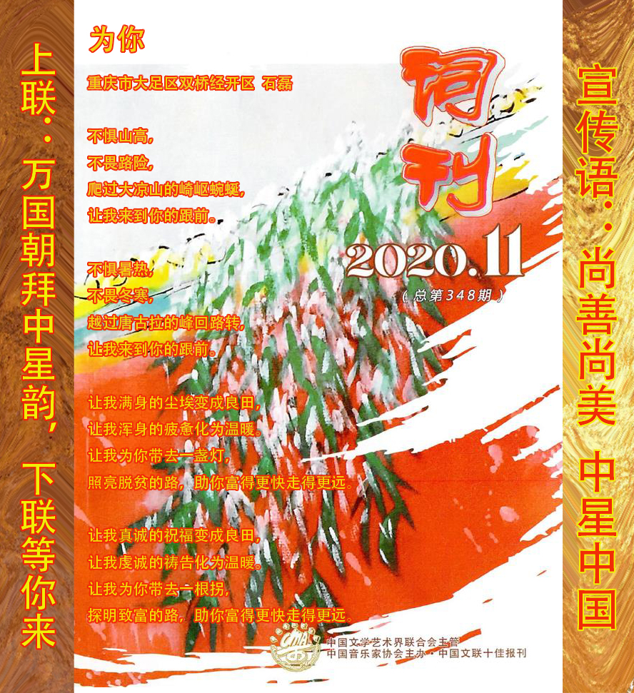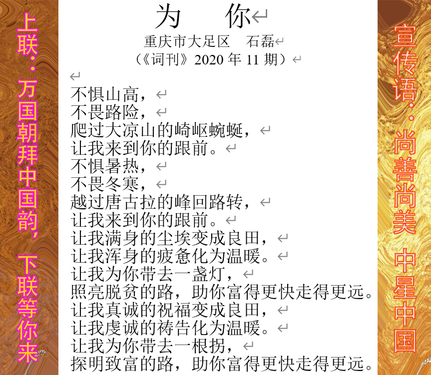 最后,就用笔者撰写的公益广告语“尚善尚美,中星中国”作为本文的结束语吧!愿我们伟大的祖国成为全世界最靓丽的星;愿我们中华民族的文学艺术成为世界文化瑰宝中最靓丽的星;也祝愿我们独具中华民族特色的广告语响彻世界,成为最靓丽、最耀眼的那颗星!