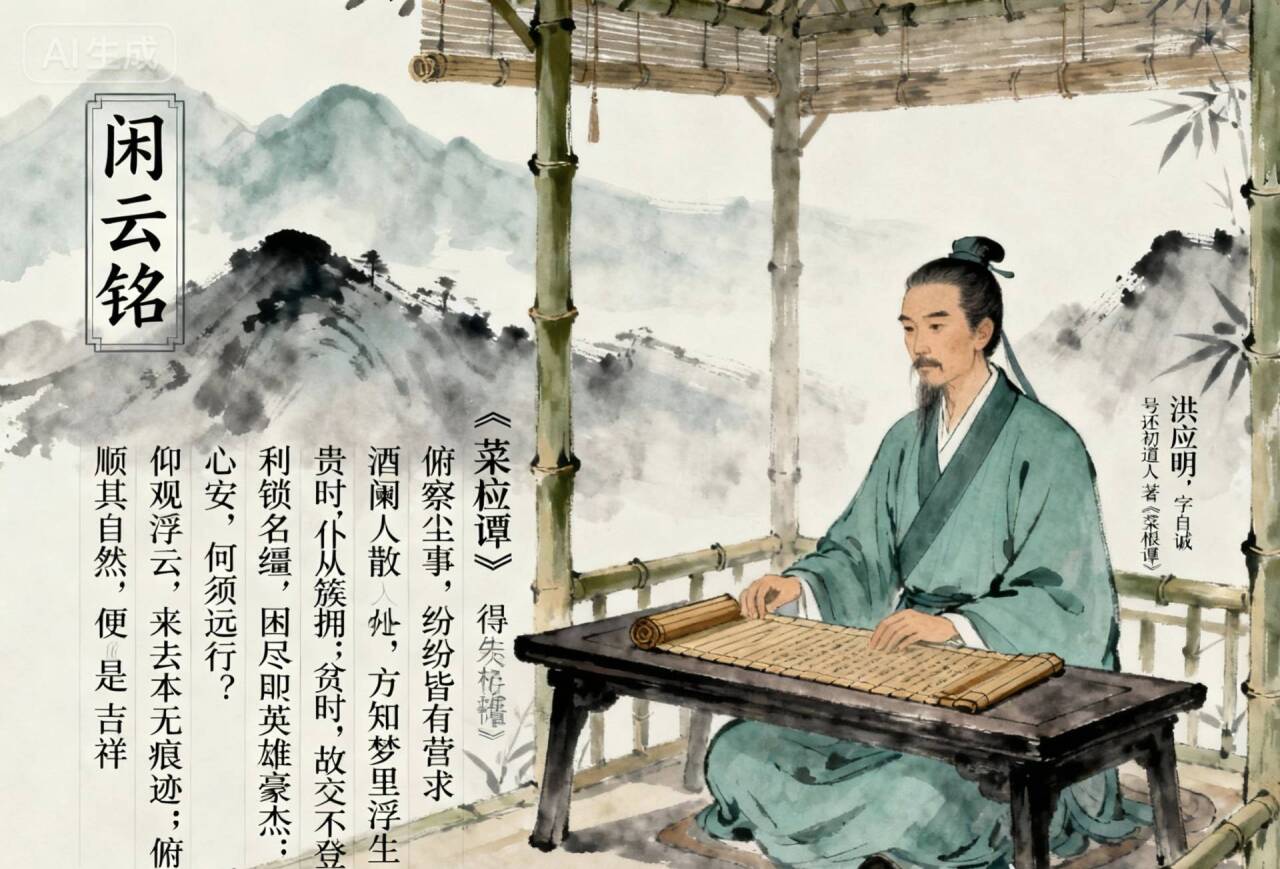 人生在世,几多浮沉?短短数十载,谁又能真正看透?然而有这样一篇短文,不足百字,却字字如刀,刻进人心深处,令人读罢久久不能平静。它就是相传为明代学者洪应明所作的《闲云铭》。洪应明,字自诚,号还初道人,生平事迹不详,唯从其所著《菜根谭》中可窥见其人思想之一二。他历经世事沧桑,看尽人间百态,既入过红尘,也近过山水,最终归于淡泊宁静。正是这样一位洞明世事的智者,写下了这篇《闲云铭》,篇幅虽短,却如暮鼓晨钟,唤醒迷途之人。
