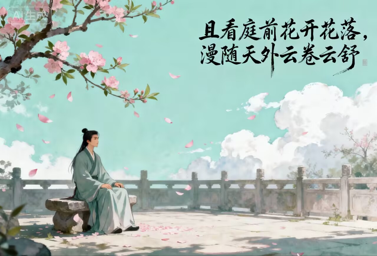最后,他以一句收束全篇:“且看庭前花开花落,漫随天外云卷云舒。”这句话,如清泉流淌,涤荡人心。院子里的花,开了又谢,谢了又开,本是自然;天边的云,聚了又散,散了又聚,也无需挽留。人生亦当如此——不因得而狂喜,不因失而悲泣,静观世事流转,守住心中一方净土。