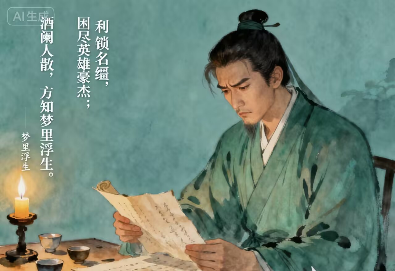 接着,他写道:“利锁名缰,困尽英雄豪杰;酒阑人散,方知梦里浮生。”多少英雄人物,一身才华,却终究被名利的锁链捆住手脚,困于庙堂或江湖,不得解脱。等到酒席散场,夜深人静,独坐灯下,才恍然明白:原来半生奔波,竟如一场大梦。这“梦里浮生”四字,道尽了多少人浑浑噩噩的一生。