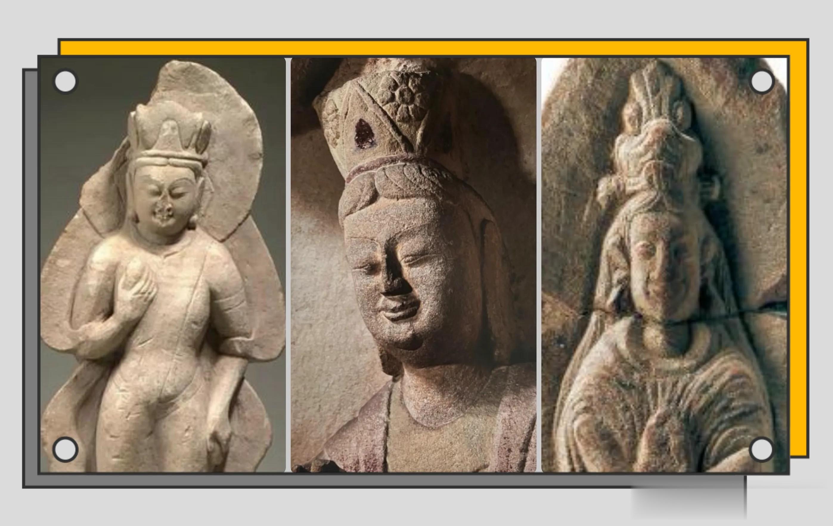 相较于厚重的三面宝冠,这类冠式更加轻盈。冠顶以三瓣叶状或三珠状凸起为主体,线条流畅,装饰简约,部分造像还会搭配中原常见的卷草纹、忍冬纹。
