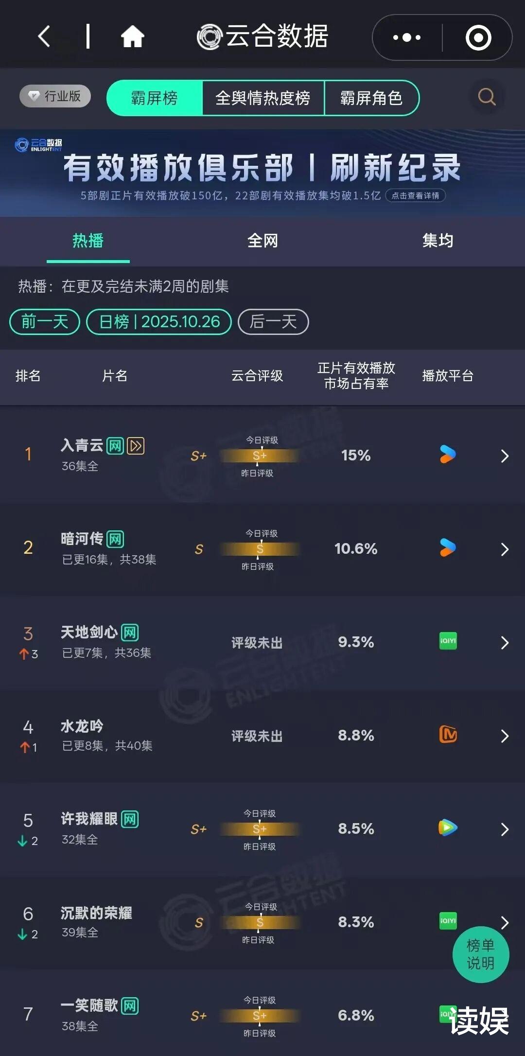 云合数据显示,优酷独播的《入青云》与《暗河传》近期持续占据榜单前二,前者是“周木楠少年江湖系列”的武侠新作,后者则是颠覆传统叙事框架的新仙侠剧,两种不同类型剧集同时获得了观众的高度认可。
