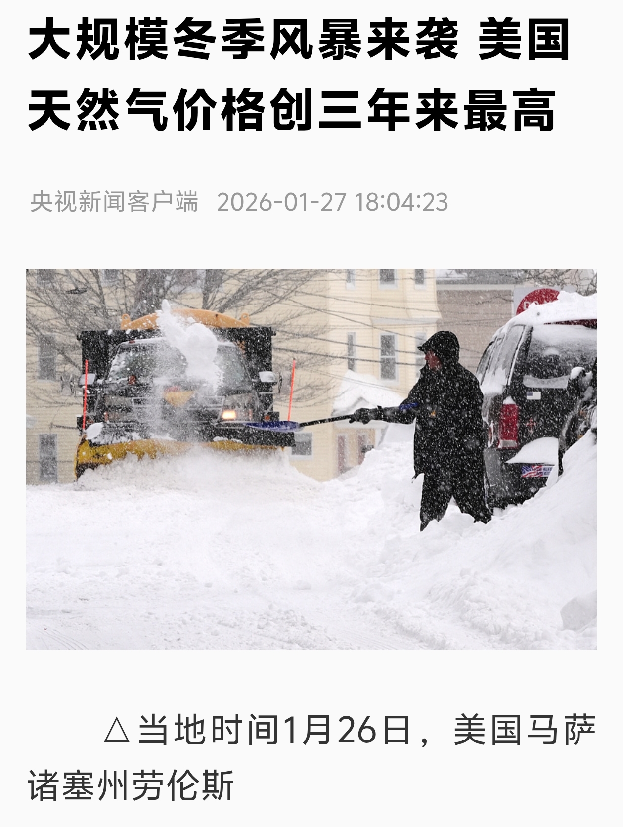 2026 年 1 月底,名为 “Fern(弗恩)” 的强劲冬季风暴横扫美国大部分地区,从南部德州至东北新英格兰,覆盖超过 2 亿人生活区,带来创纪录的低温、降雪与冰雨。这次寒潮不仅造成美国交通与基础设施严重中断,还引发美国能源系统的连锁反应:电力现货价格一度暴涨 1400%,天然气价格飙升至多年高点,数十万家庭断电,直接将美国应对重大灾害能力的不足暴露无遗。