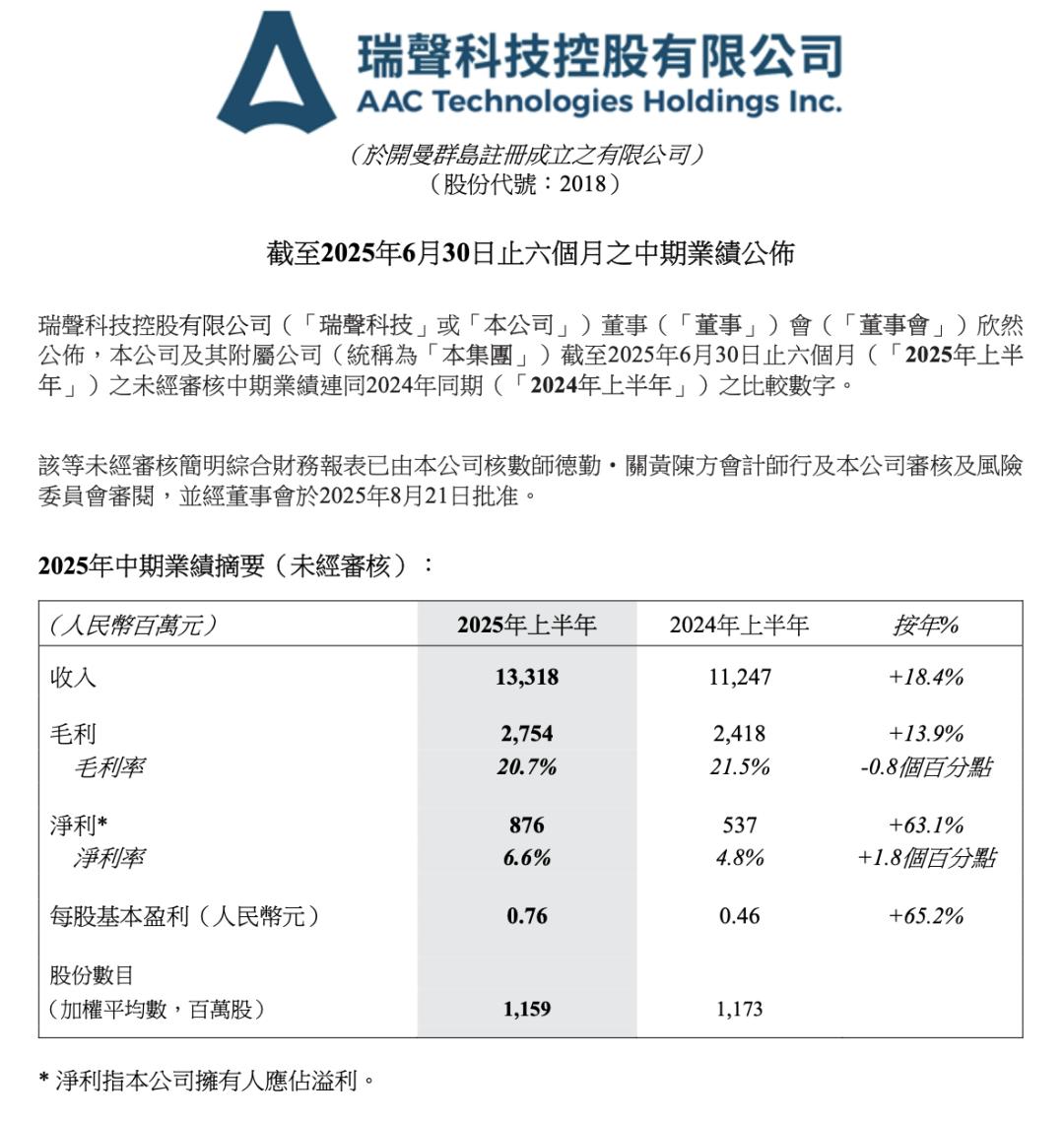 2025年瑞声的中期财报显示,其车载业务营收达17.4亿元,同比增长13%,车载业务已成为稳固的第二增长曲线。
