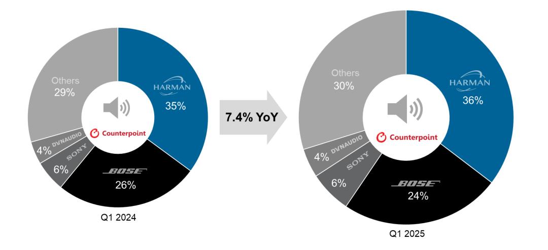 全球乘用车音响系统销售额占比,Bose和哈曼占了六成以上。图片来源:Counterpoint