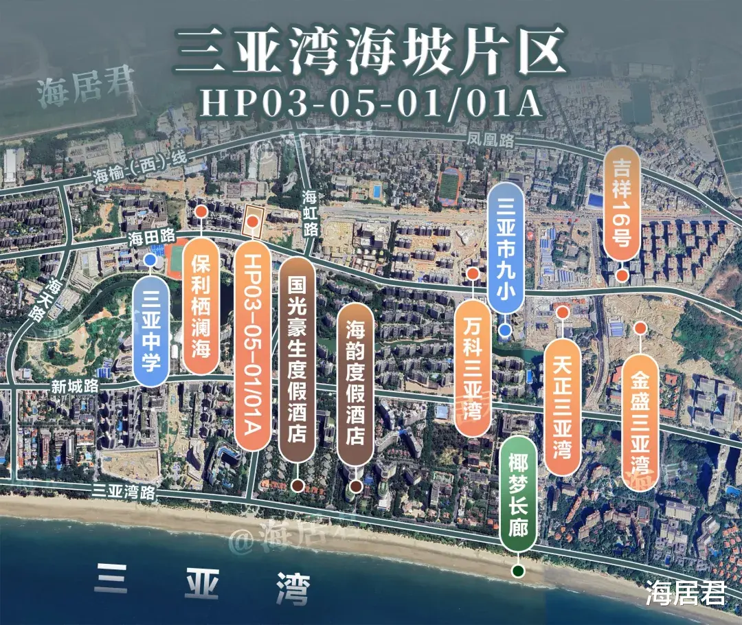从现状周边布局来看,HP03-05-01/01A地块西侧是保利栖澜海小区、东侧规划文化混合体育用地、北邻农贸市场、南邻占地规模高达200多亩的三亚中学。