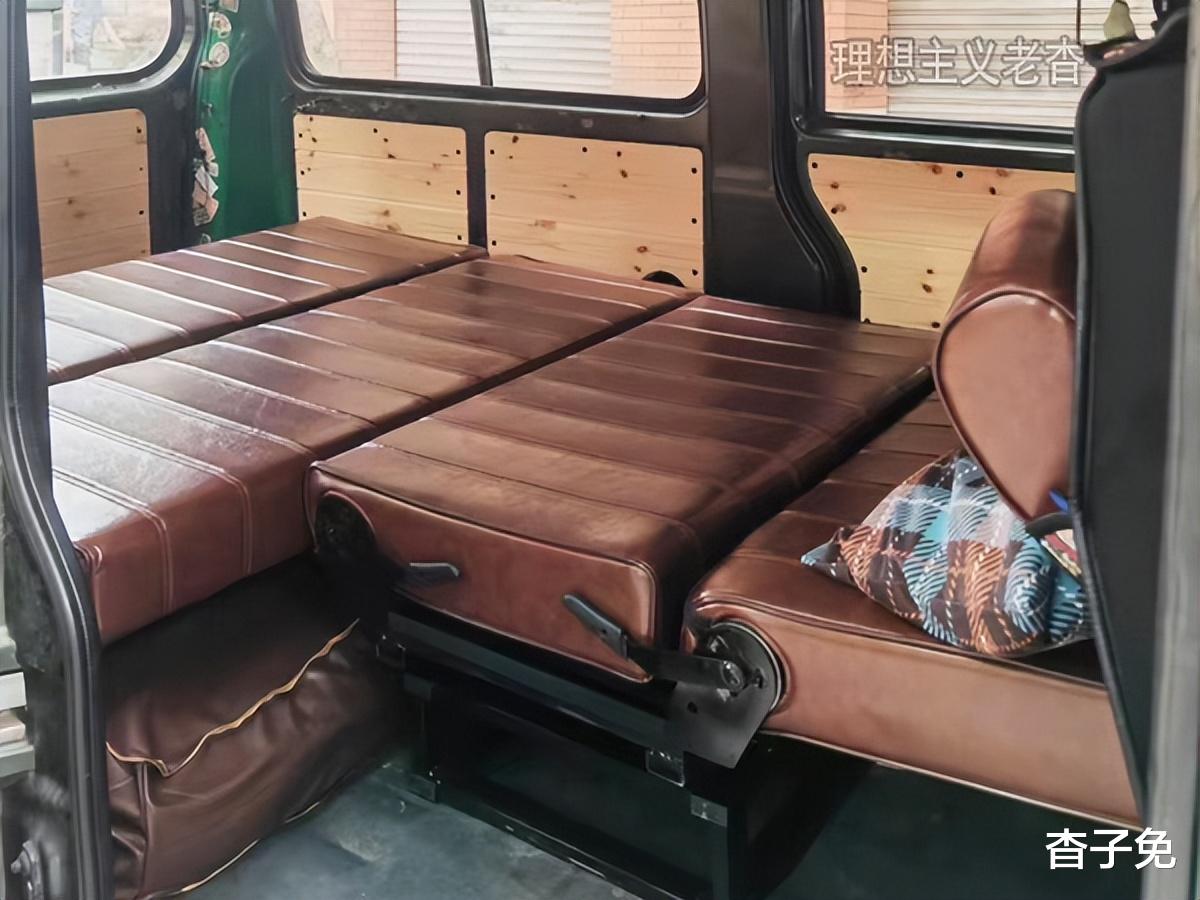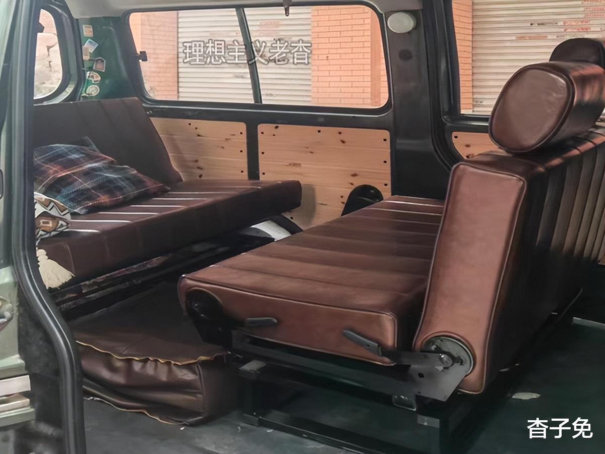 打开右中门,内墙实木装修,中后排座椅换成了床车专用椅,中排座椅已向后翻转,与后排形成对座,中间最好再添置一张升降桌,就可组成车载小客厅。