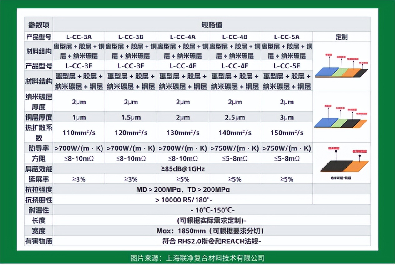 除此之外,纳米碳铜箔还具备更突出的实用性——模切后边缘整齐无粉尘,不易破裂,便于返修和二次使用,综合成本仅为人工石墨片的二分之一,既适配5G高频器件、新能源电池的热管理与电磁防护需求,也能广泛应用于消费电子、高端设备等场景,进一步拓展了复合屏蔽材料的应用边界,是对传统导热、屏蔽材料分类的又一创新延伸。