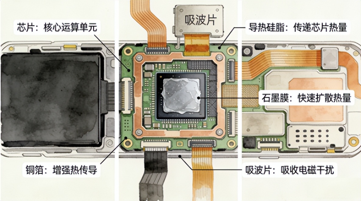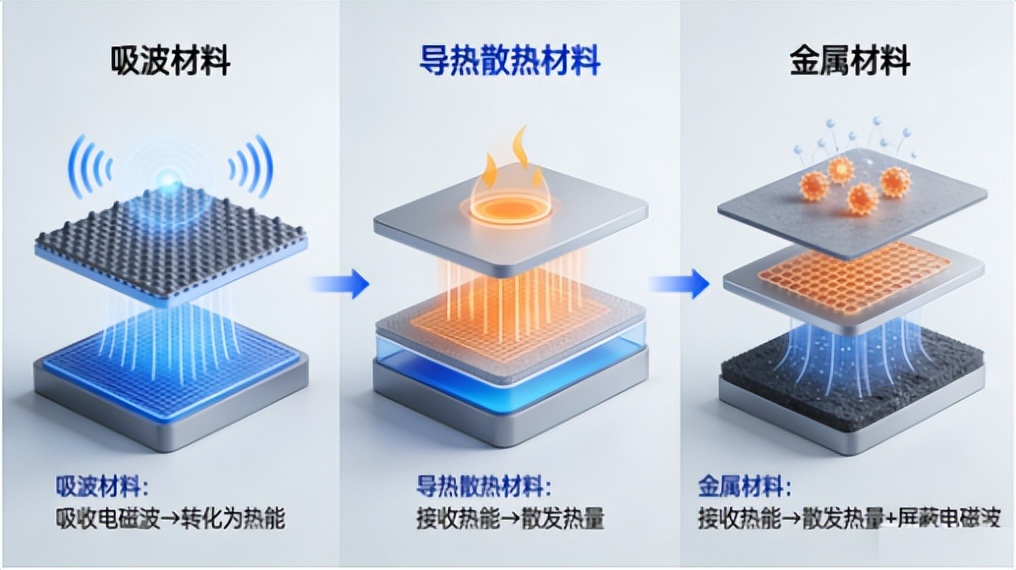 举个简单例子:一款高端手机中,芯片产生的热量,由导热硅脂(导热材料)传递到石墨膜(散热材料),再散发到空气中;同时,手机内部的铜箔(电磁屏蔽材料)阻挡外部电磁波干扰,而精密芯片周边的吸波片(吸波材料)吸收多余电磁波,避免二次干扰——四种材料各司其职,缺一不可。