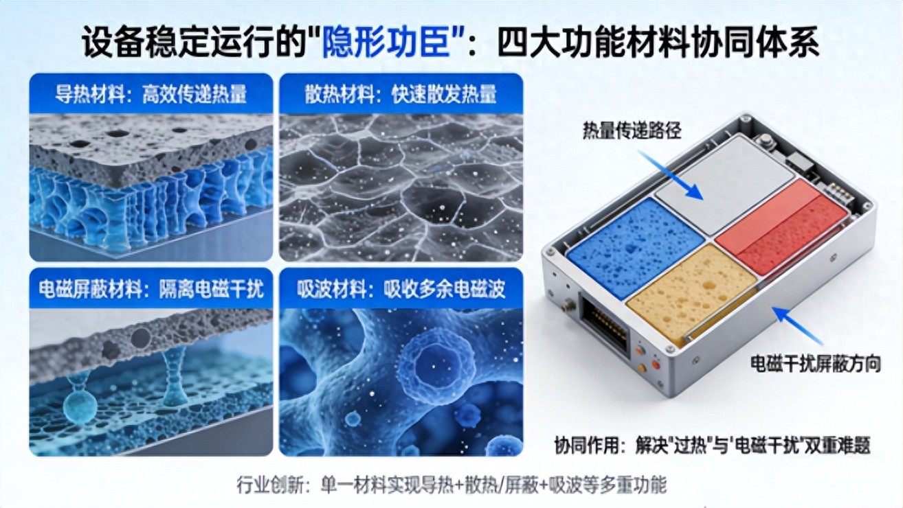 在5G通信、新能源汽车、高端电子设备快速迭代的今天,有四种“隐形功臣”始终支撑着设备的稳定运行——导热材料、散热材料、电磁屏蔽材料和吸波材料。它们看似独立,却在设备内部形成协同体系,既解决“过热”难题,又抵御“电磁干扰”,而行业创新正打破传统材料的单一功能边界,让一份材料实现多重价值。