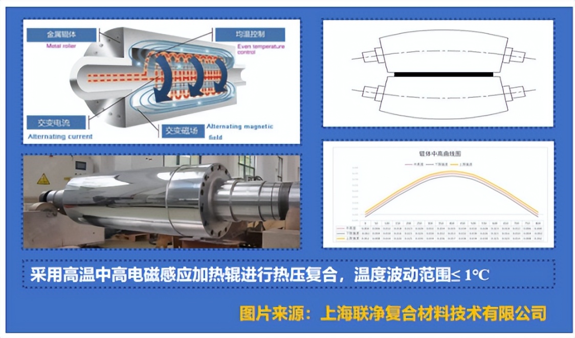 多功能复合材料的研发,离不开核心生产装备的支撑。传统热压复合设备难以满足高精度、高温控的复合需求,比如LCP与铜箔复合时,两者热膨胀系数差异大,易产生变形,影响产品性能。行业内已出现高精度热压复合设备,通过“微观形变补偿技术”,将热压辊设计为纺锤形,精准补偿辊筒在高温高压下的微米级变形,同时将热压辊温度精度控制在±1℃,机械精度维持在±0.001mm,既能实现LCP与铜箔的精准复合,又能提升产品良率至98%以上,降低能耗。