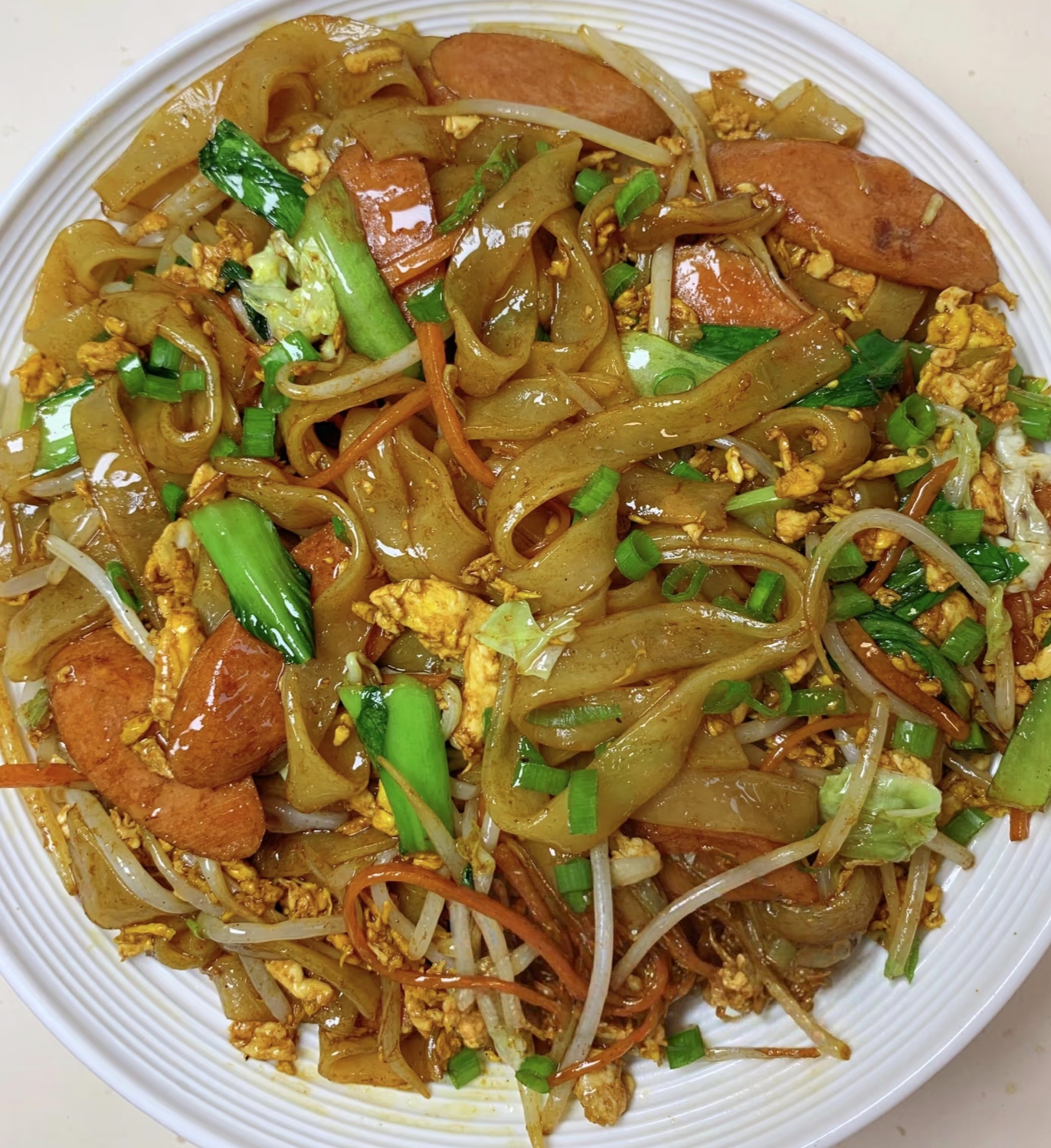 准备河粉300g(选新鲜湿河粉更弹牙),鸡蛋2个(溏心蛋爱好者请加到3个),绿豆芽1把(掐头去尾更清爽),胡萝卜丝50g(切细丝假装很精致),小葱3根(葱白葱绿分开用),火腿肠1根(斜切成片才有灵魂),青菜两颗。