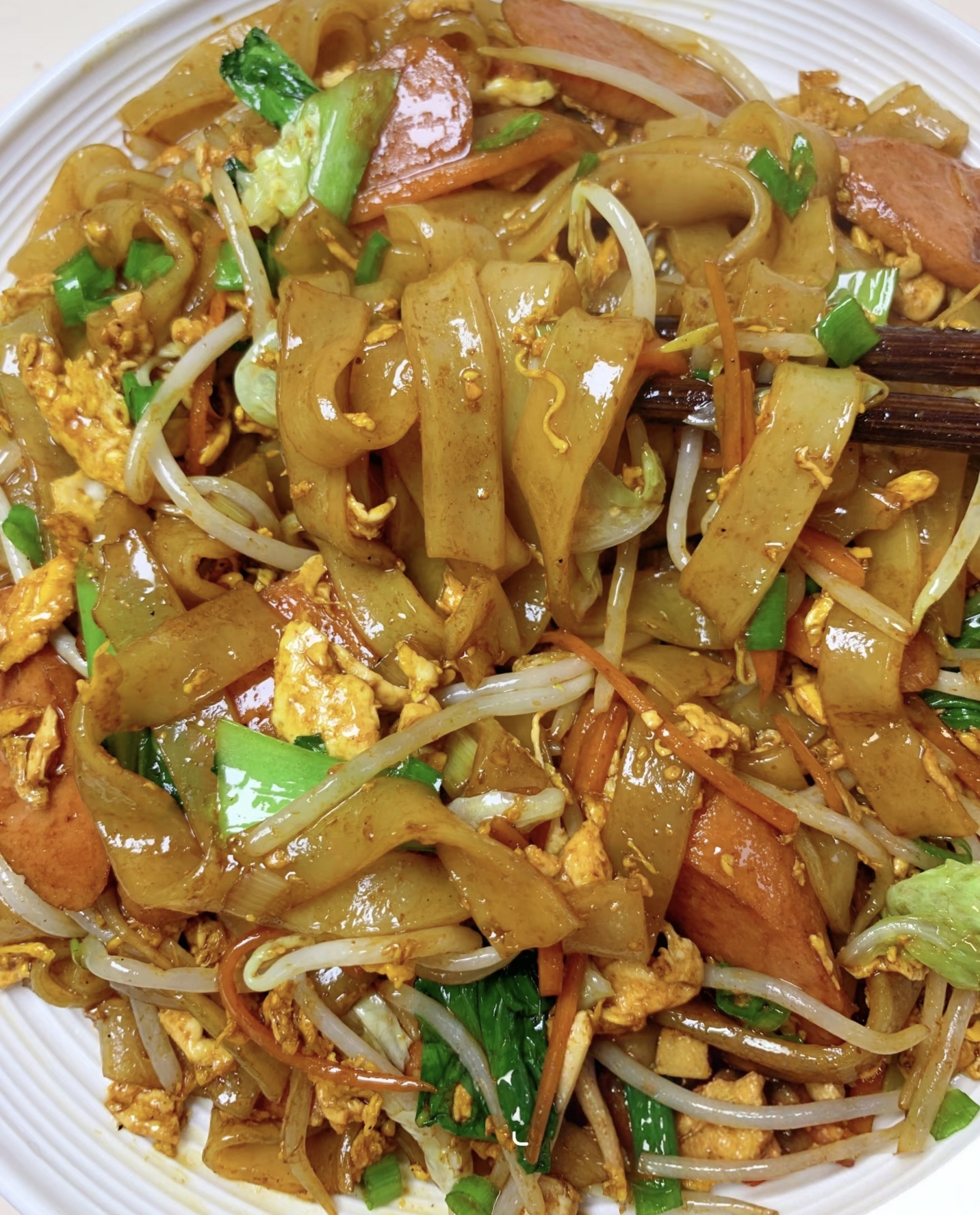 把蔬菜推到锅边,中间留出空位倒入河粉。重点来了:用筷子代替锅铲!像挑面条一样轻轻抖散,让每根河粉都均匀受热。这时候倒入调好的酱汁,继续用筷子翻拌,直到河粉裹上诱人的焦糖色~最后放入鸡蛋、和葱绿,转大火颠锅(不会颠锅的姐妹用筷子快速翻炒也行!),让所有食材在锅里来个热情拥抱。出锅前淋半勺香油,香气直接冲破天灵盖!