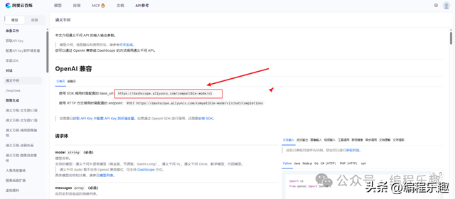 在API文档介绍里,我们就可以看到大模型Url: https://dashscope.aliyuncs.com/compatible-mode/v1