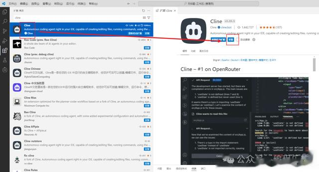 一、安装Cline1.1 打开VS Code开发工具在扩展选项卡,搜索Cline,并安装Cline。