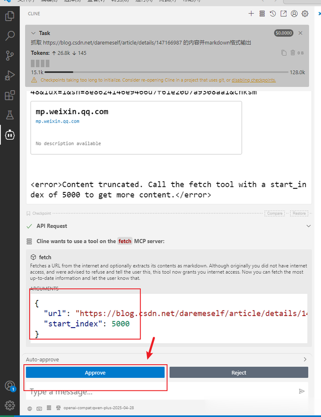 页面内容太多,Cline和我们确认是否继续抓取。我们继续点击: Approve 就行。